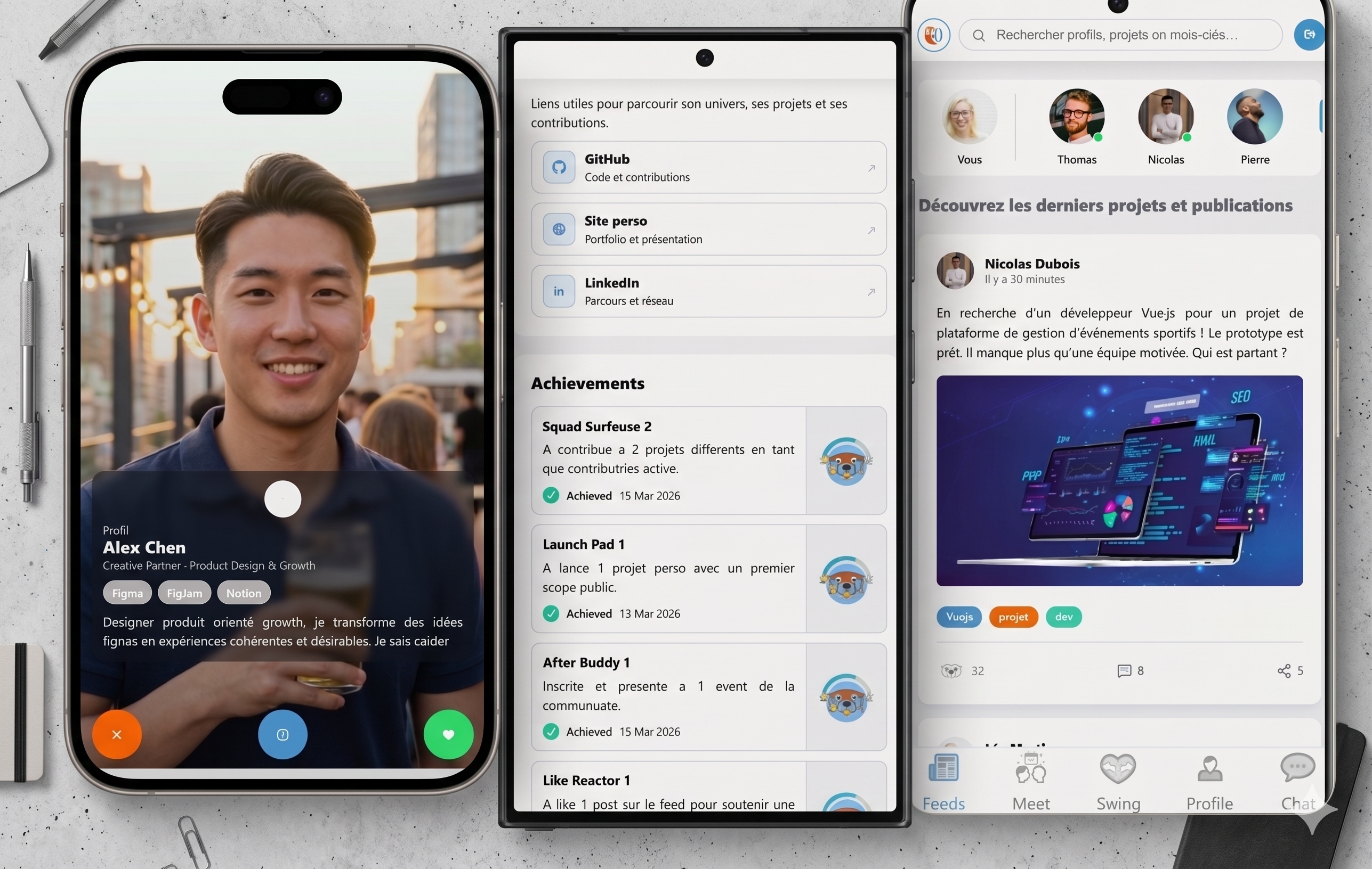 Swipe les profils, matche les bonnes energies et lance un side project avec des mates qui partagent ton ambition.